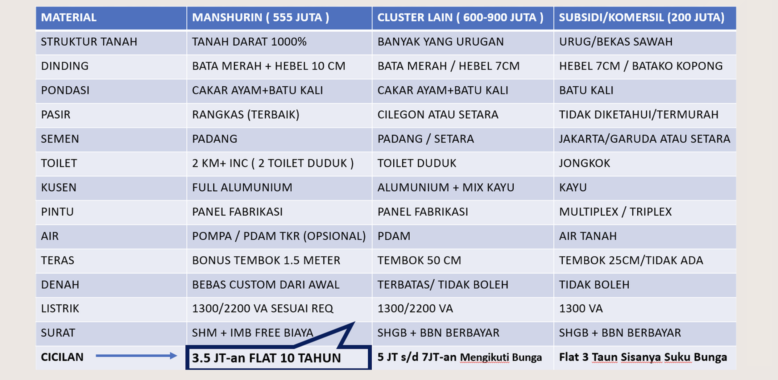 PERUMAHAN INI MENGGUNAKAN PEMBIAYAAN SYARIAH YANG DIMANA TIDAK MEMAKAI PIHAK KETIGA SEPERTI PERBANKAN/LEASING. JADI SANGAT MEMUNGKINKAN UNTUK SIAPAPUN UNTUK MEMILIKI RUMAH DISINI KARENA TIDAK MEMAKAI SISTEM B.I CHECKING. SERTA KAMI MEMILIKI LEGALITAS YANG LENGKAP DARI PERIZINAN SAMPAI SURAT-SURAT SEHINGGA KONSUMEN TIDAK PERLU KHAWATIR ATAS LEGALITAS PERUMAHAN MANSHURIN SUKABARU